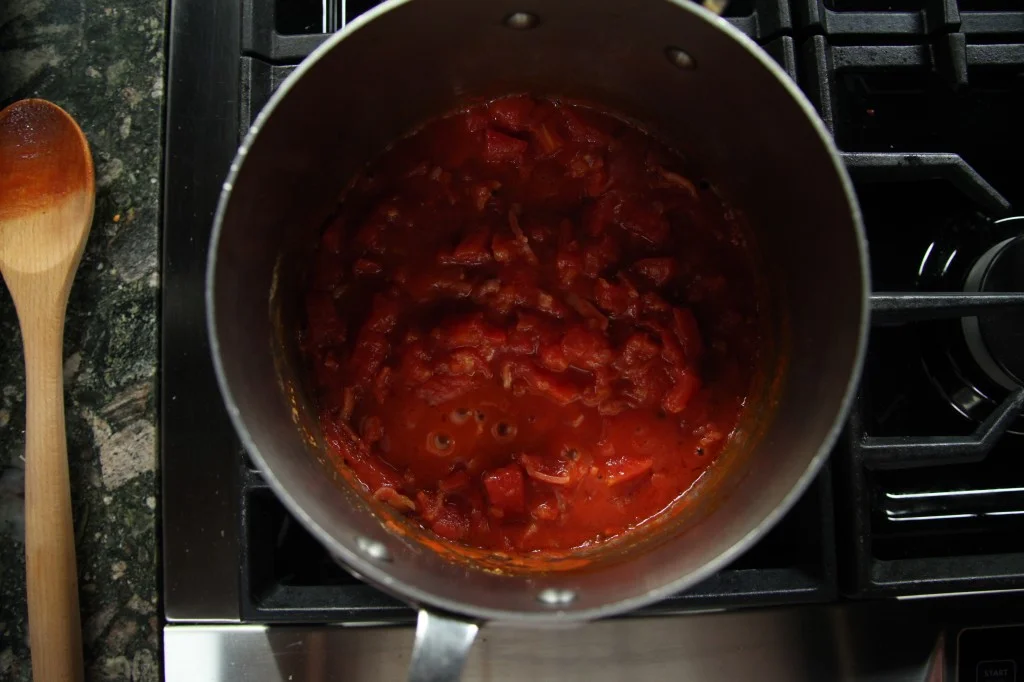 2 lbs. of fresh tomatoes or canned whole peeled tomatoes in their juice 5 TBS butter 1 1/4 tsp salt 1 medium sweet yellow onion 1/3 cup grated Parmigiano-Reggiano cheese (for topping dish)