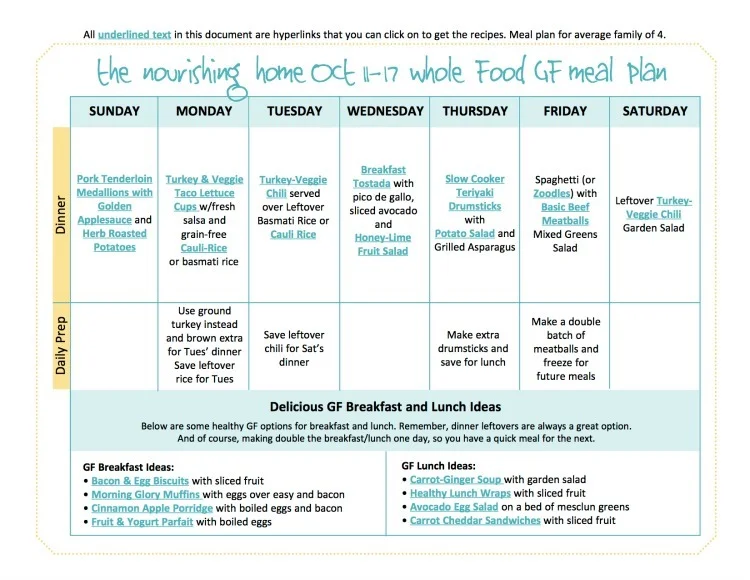 Bi-Weekly Whole Food GF Meal Plan for October 11-17: (To print the meal plan provided below, simply click on the graphic or click here and it will open a pdf into a new window for easier saving and printing. Remember, many mobile devices and tablets are not able to open links within a pdf. So save the meal plan to your computer first.)