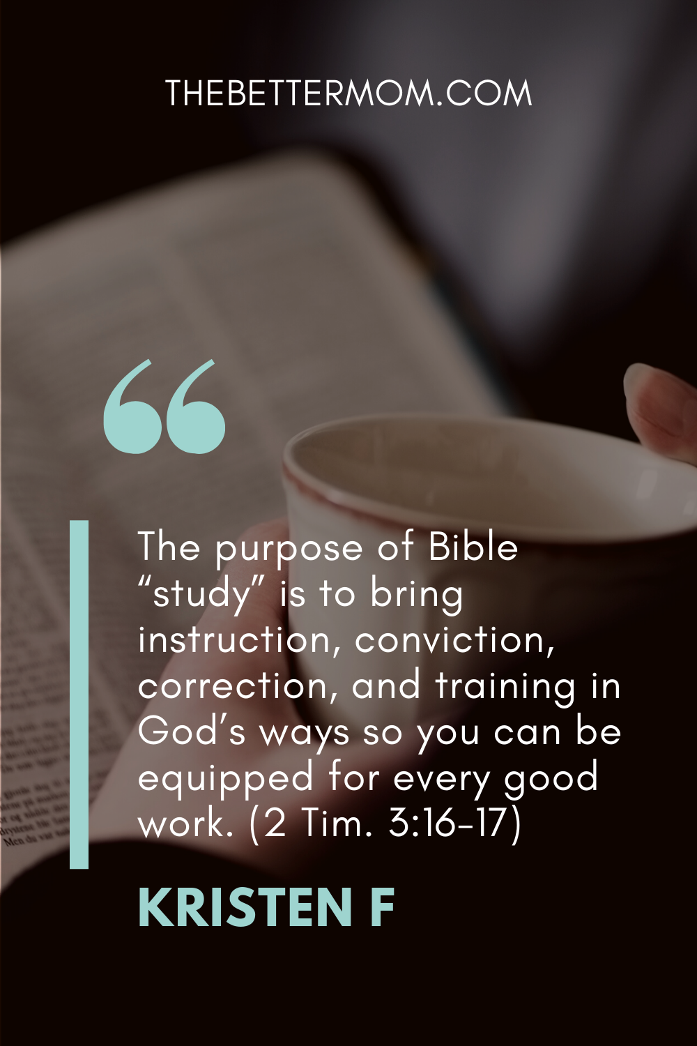 The purpose of Bible “study” is to bring instruction, conviction, correction, and training in God’s ways so you can be equipped for every good work. (2 Tim. 3:16-17)